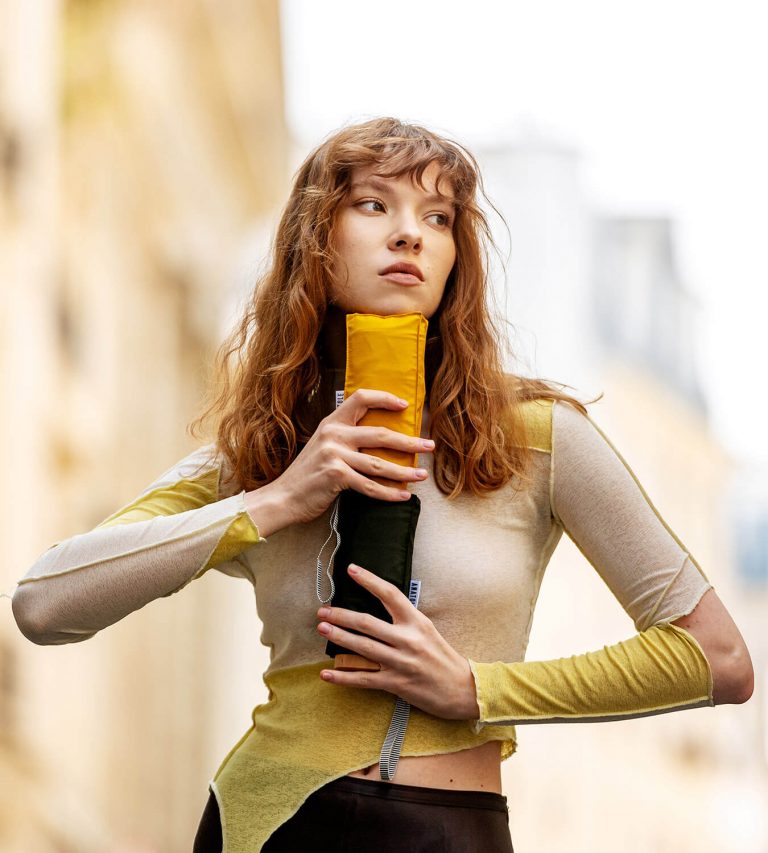 The yellow colour of our umbrella, Martin, was engineered especially to work with the luminosity of rainy days : it has shades of mustard yellow, and still stays bright under grey skies.