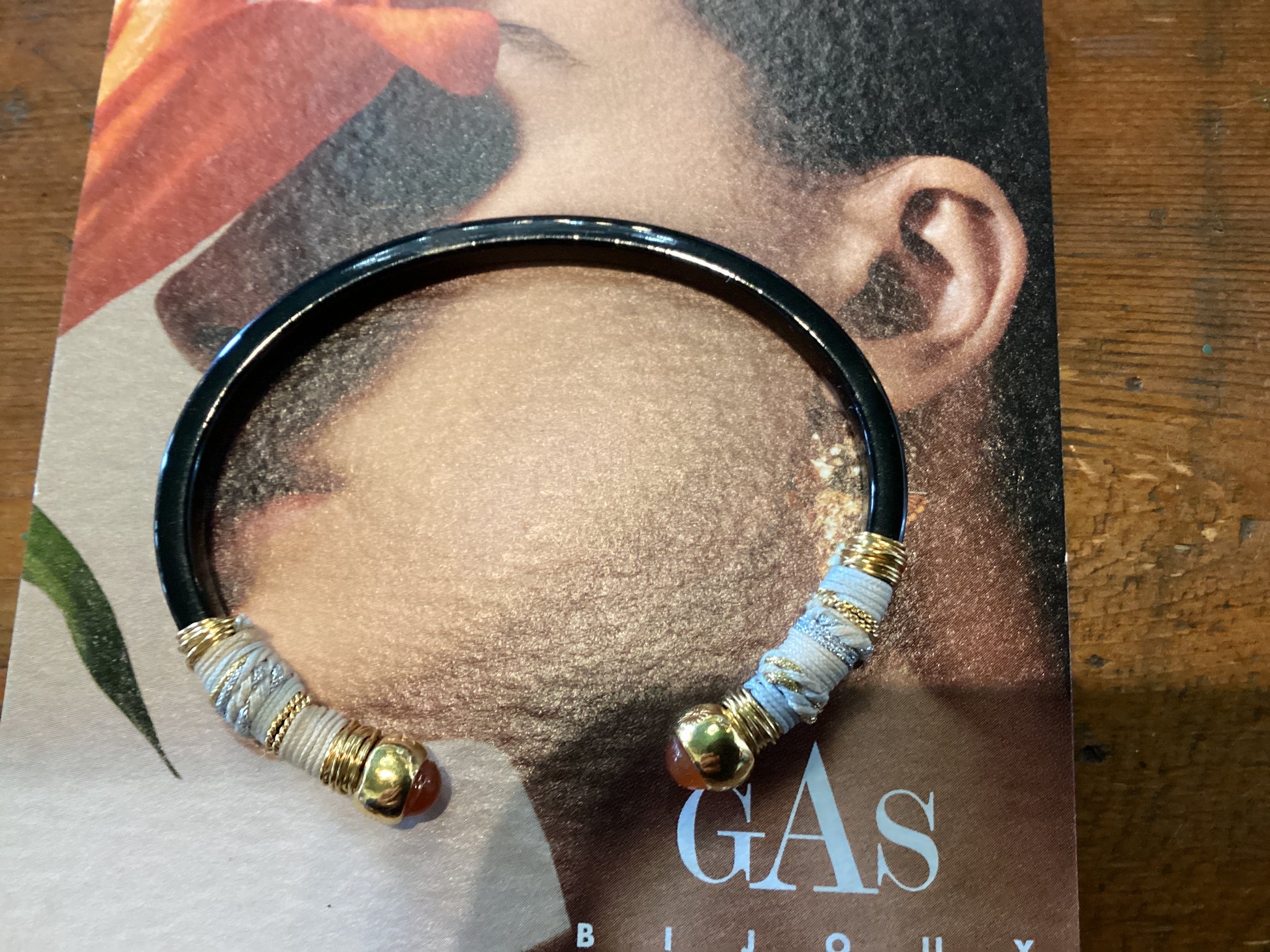 Acetate bangle bracelet wrapped in coloured threads and golden wire. This bracelet is ended by two gold plated balls.