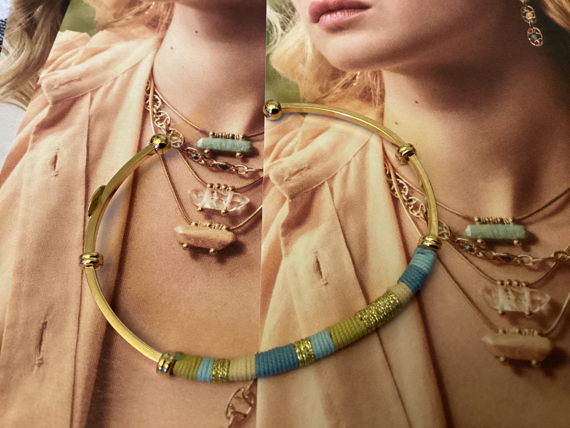 Dainty gold plated bangle, wrapped in part by cotton threads. You can stack it with other bracelets to create a summery arm candy.