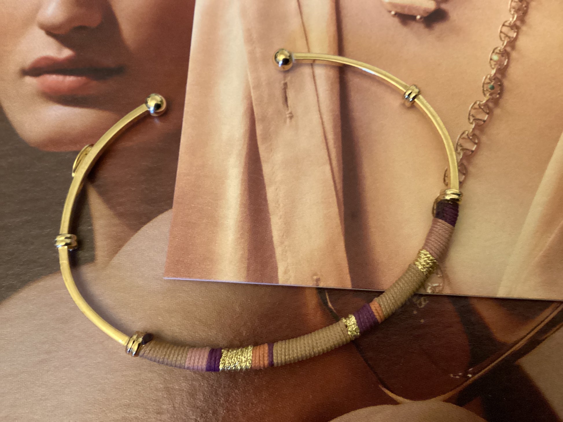 Dainty gold plated bangle, wrapped in part by cotton threads. You can stack it with other bracelets to create a summery arm candy. Adjustable size.