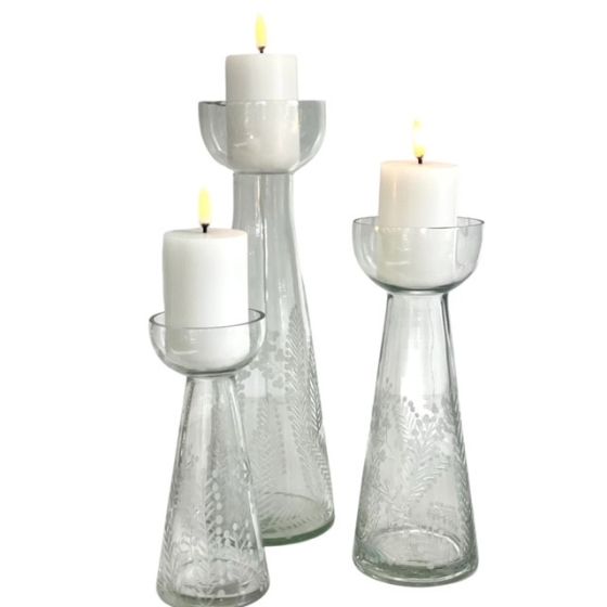 Beautiful Cone shaped etched wattle glass candle holders - perfect for Christmas or any other day!
