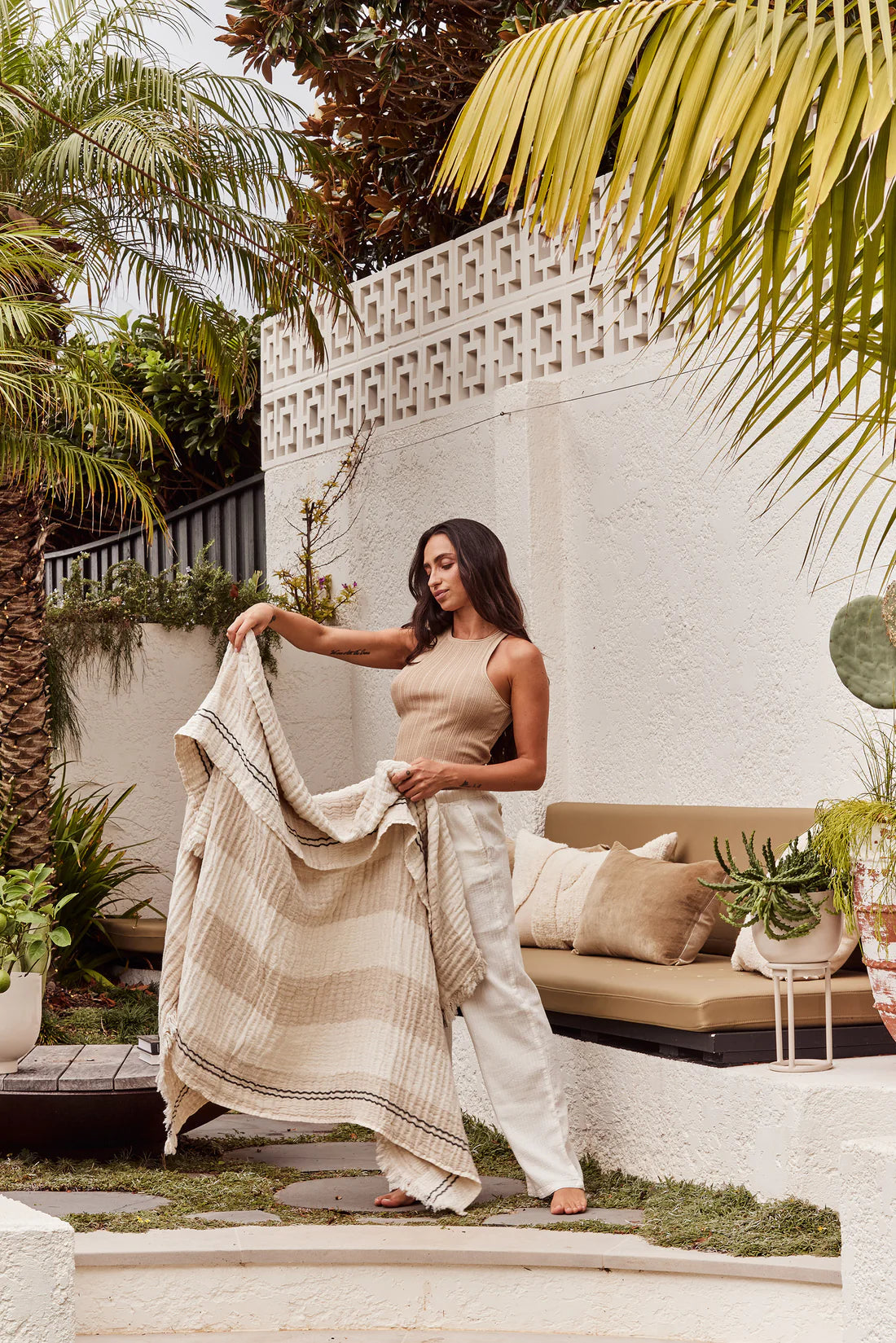 The yarn in this throw is boiled and then twisted together before weaving to create the crinkled texture of this piece.