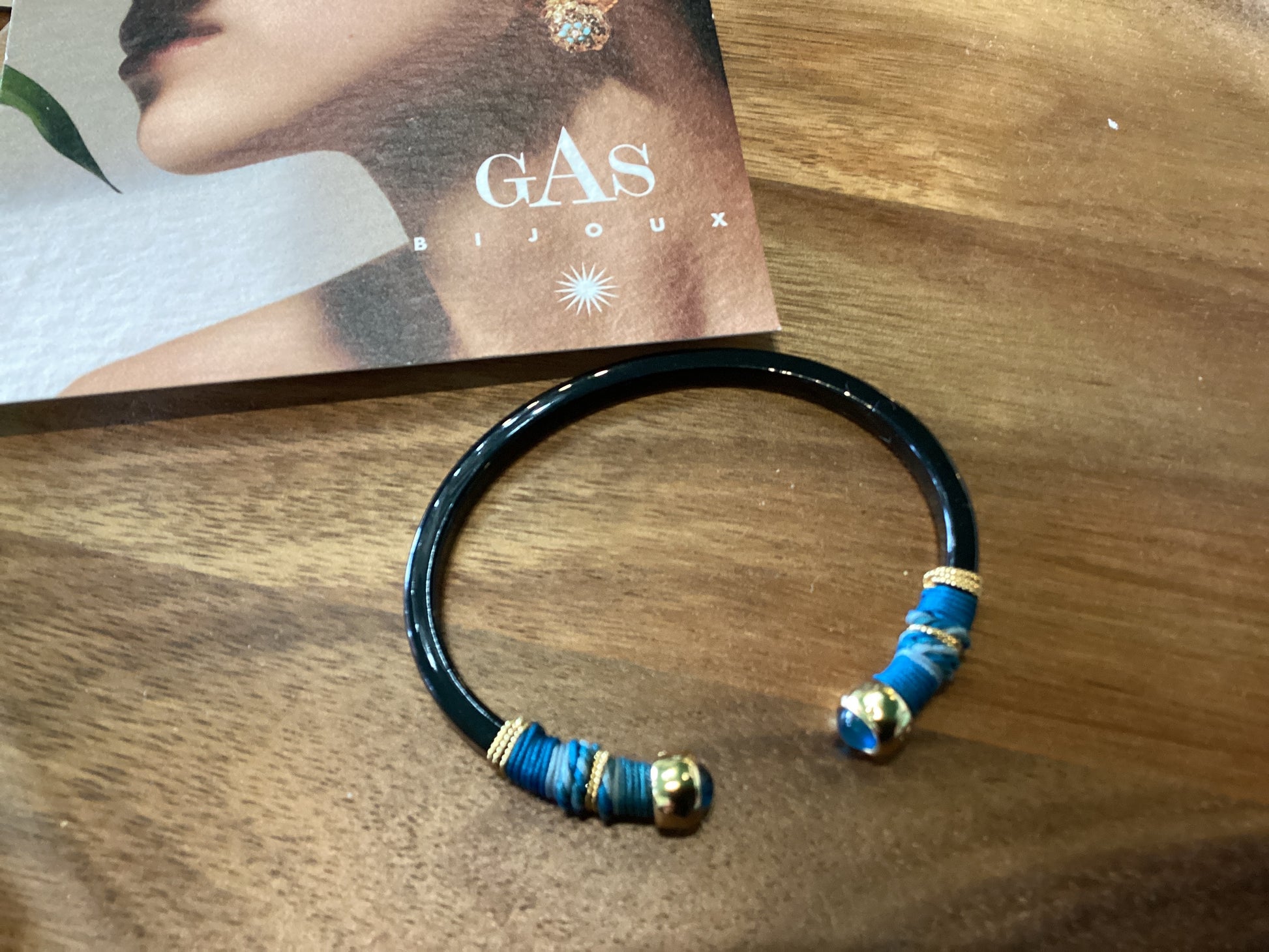 Fine acetate bangle bracelet wrapped in coloured threads and golden wire. This bracelet is ended by two gold plated balls adorned with colored beads.