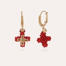 Gold plated earrings with fine gold, composed of a finely filigree openwork cross and adorned with beads. We have 2 styles available - red beads or white beads.