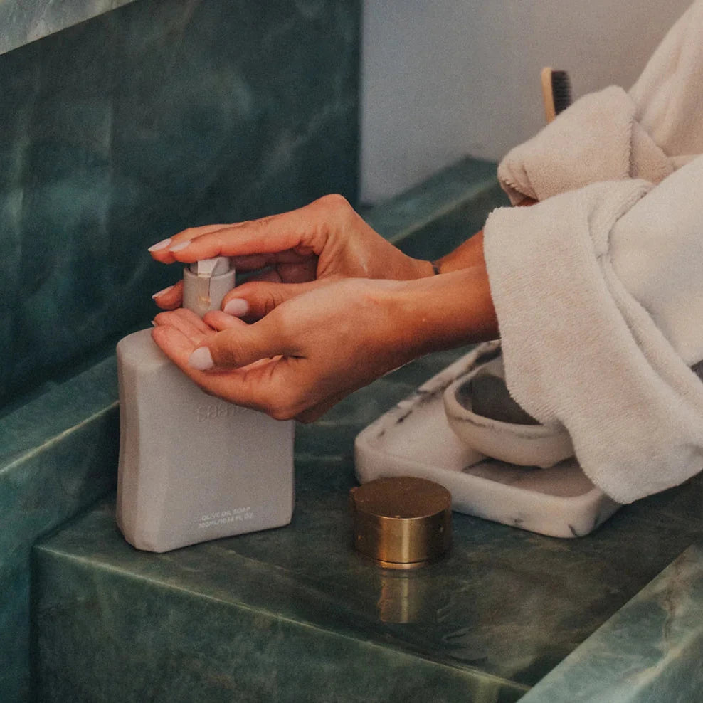 A gentle, natural liquid olive oil hand and body wash in a Saardé signature refillable glass bottle. The process and formulation of this soap were developed over many years to be particularly moisturising and nourishing.