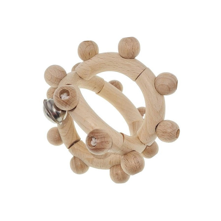 Wooden rattle in the shape of a ball, with 1 little bell, the 8 colorful wooden parts are mounted on an elastic cord which allows the rattle to be formed into a variety of shapes.