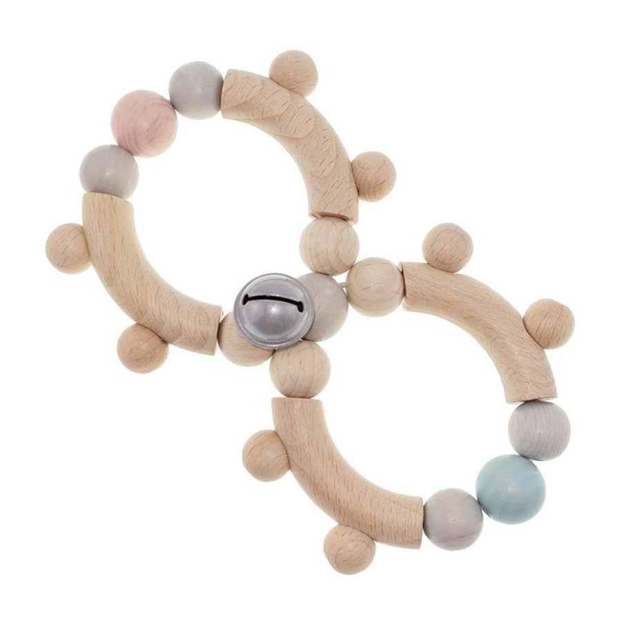 This pale pink and blue and natural wooden rattle with a bell and 8 parts mounted on an elastic cord allows the rattle to be manipulated into a variety of shapes. Great for babies and OT needs.