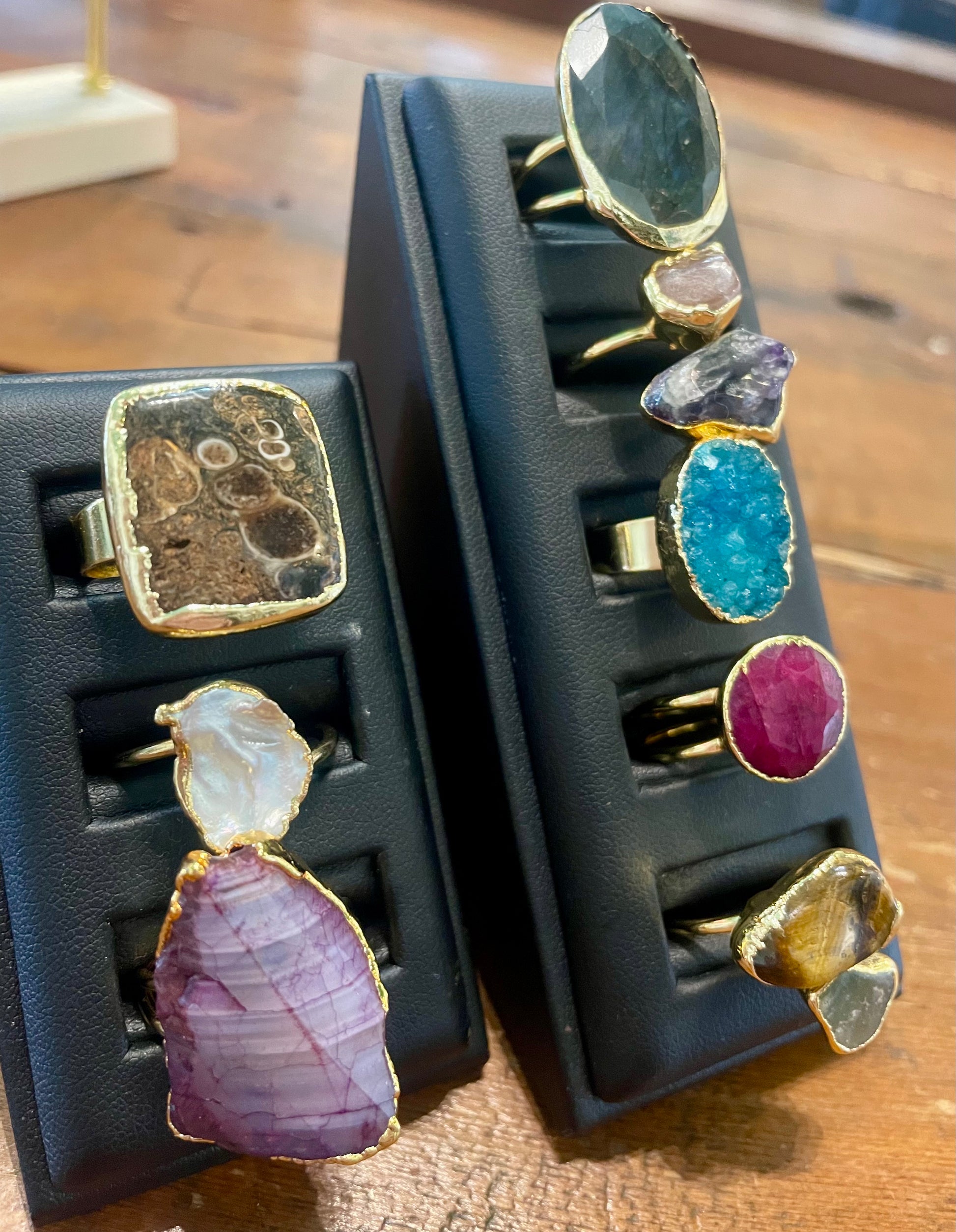 Each piece is unique - crafted according to the shape of the individual stone. Each handworked item has a brass base with an 18k gold plating. The stones range from beautiful turquoise to brightly coloured dyed quartz.
