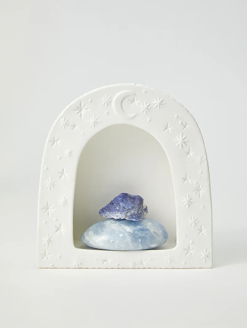 The Luna White Wall Shelf, a gorgeous arched shape ready to hang and elevate your space with celestial elegance. Perfect for displaying small treasures, from delicate vases and shimmering crystals to totems and special pebbles and shells collected on your travels. Transform any room into a personalized sanctuary where every item tells a story and every corner radiates personalisation.