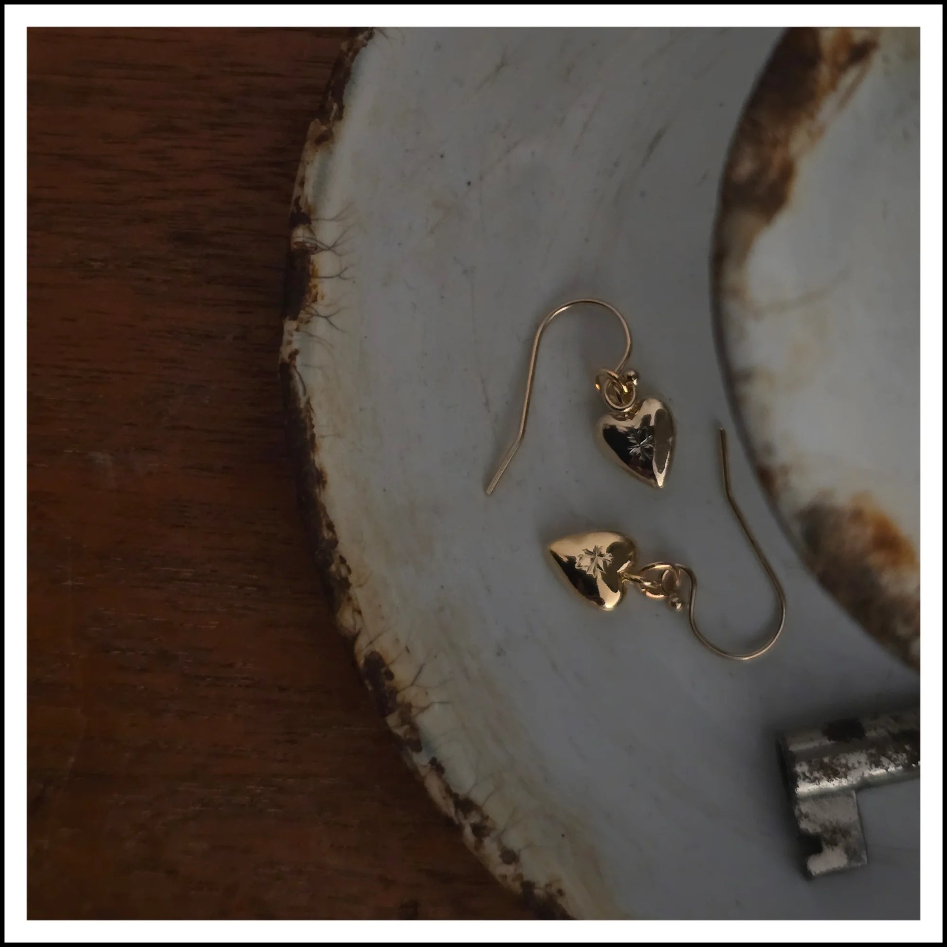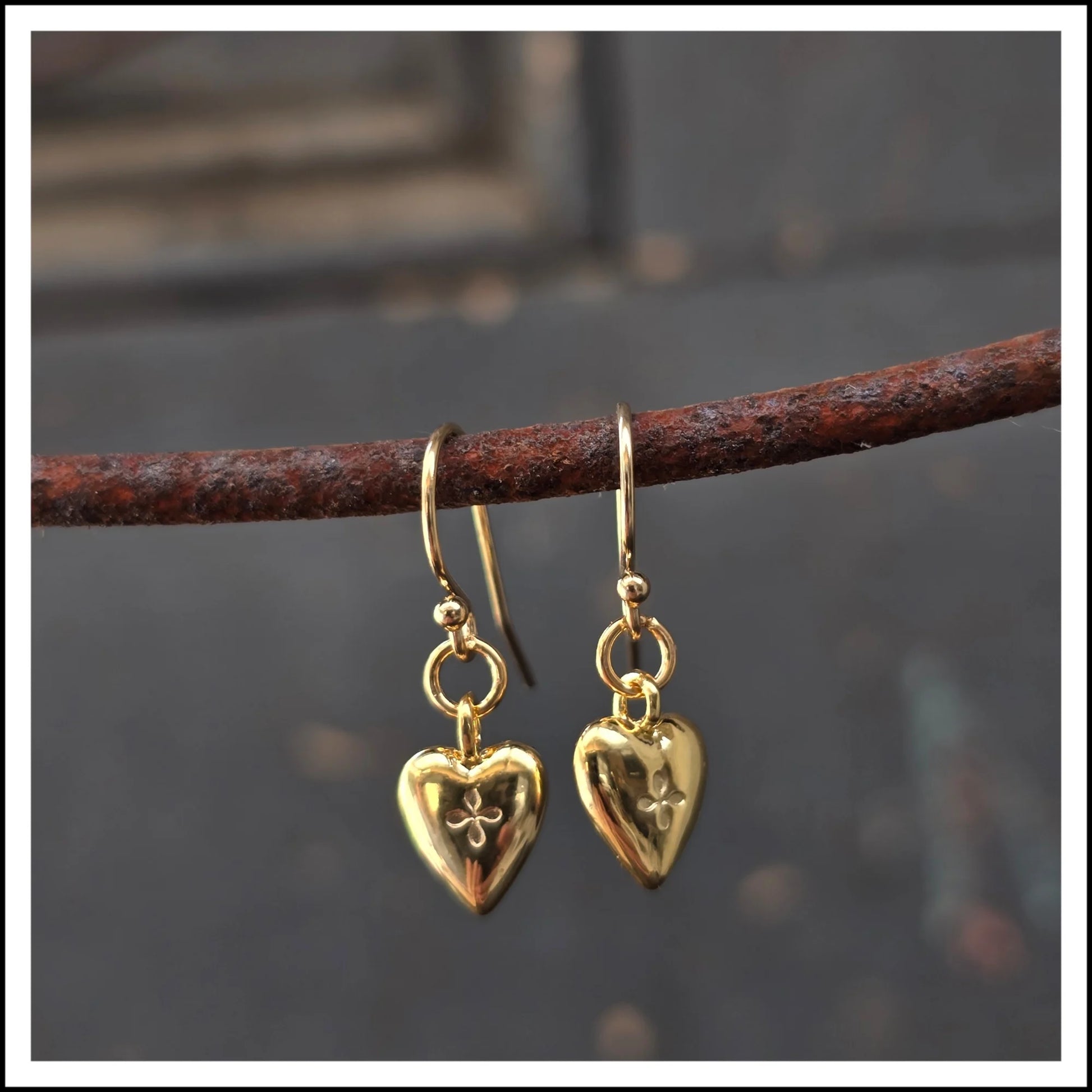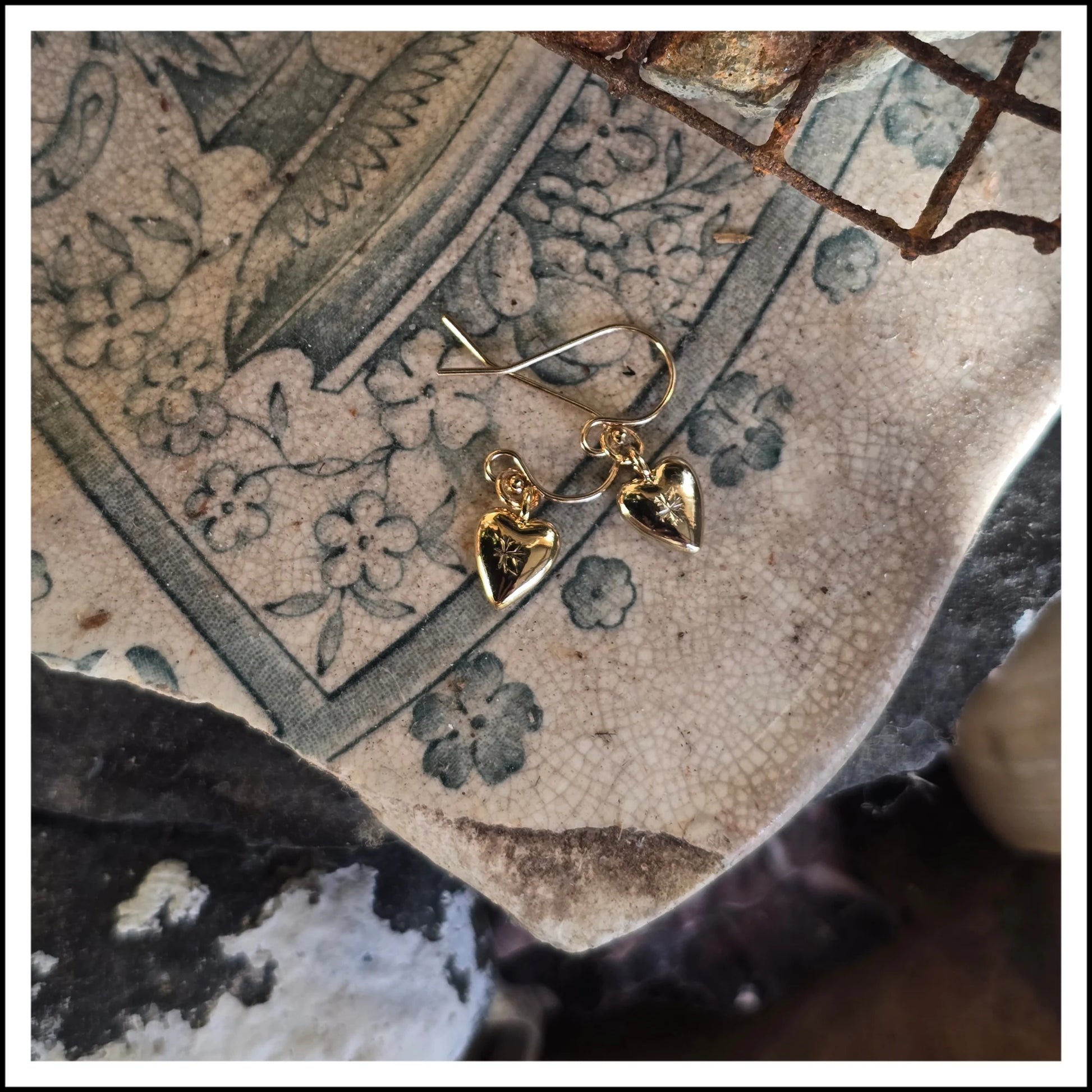 Gold plated shiny heart charms hand stamped with tiny star, suspended on gold filled earwires