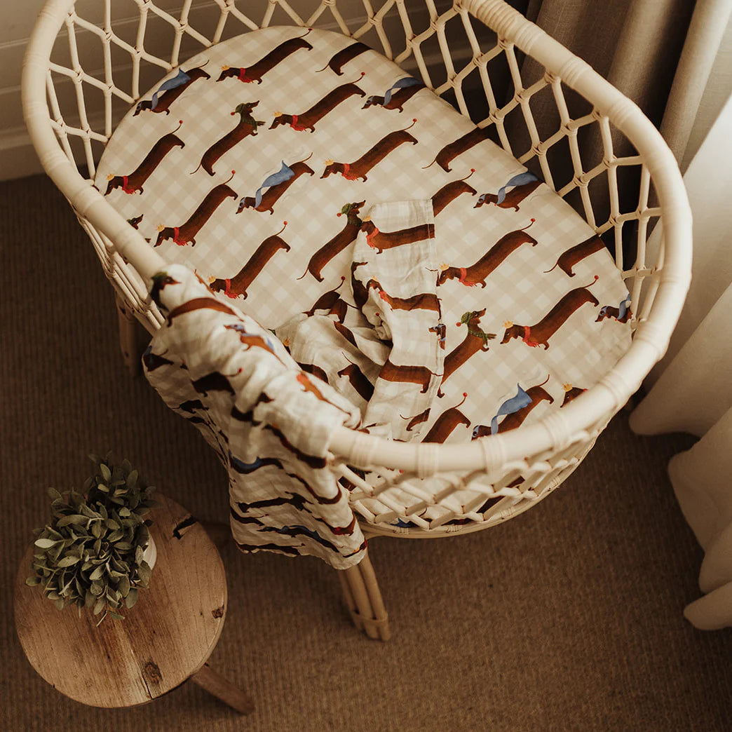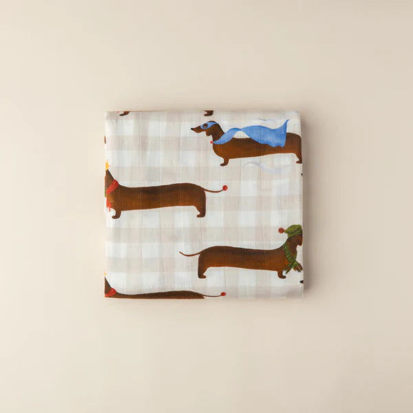 Wrap bub up in this cute and adorable Silly Sausage print that is delightful on our organic cotton muslin swaddle.